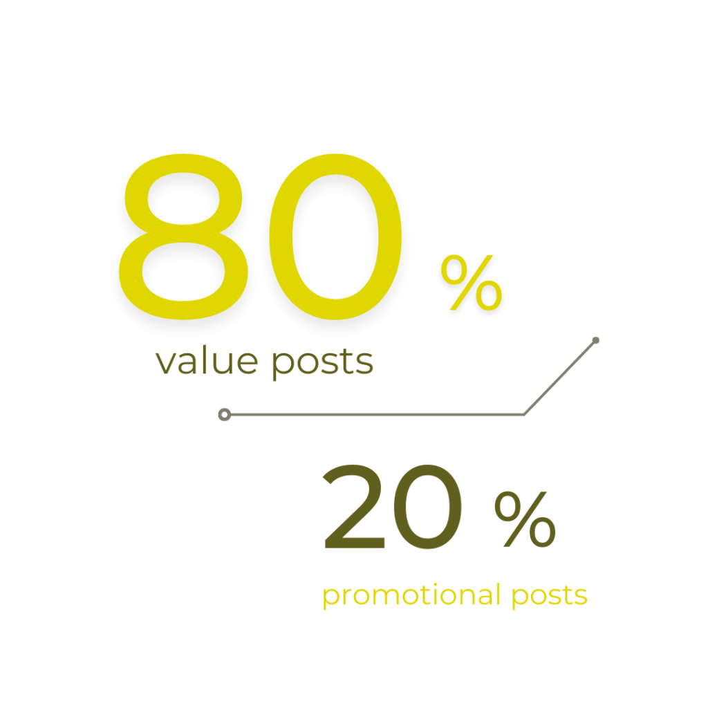 80% of your posts should be anything that educates, entertains, engages, and is inspiring for your target audience. A post that has ZERO ounce of promotion. This will build trust and a different level of connection to your audience outside of a “buyer-seller” relationship.